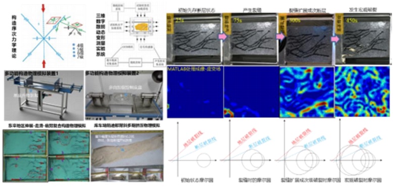 不同尺度断缝结构物理模拟和仿真模拟联合方 法 砂箱模拟装置、光弹模拟装置、多功能物理模拟装置配备机电一体化试验系统(中国石油大学(华东)、南京大学、阿伯丁大学、加利福尼亚大学),采用脆-塑性多层模型进行伸展、走滑、挤压和复合实验,未注重走滑基底作用(萨尔茨堡大学);数字散斑模拟装置采用单向应力加载,获取三维位移场和应变场数据,主要用于材料力学和岩土力学损伤检测领域(中山大学、西安交通大学) 改进多功能物理模拟仪器(SG-3000),配置多组液压机、旋转刻度底盘和应 力加载滑轮,实现多期构造模拟和应 力配比下的走滑基底升降;改进数字 散斑模拟装置的伺服液压机为双向应力加载,基于MATLAB数字图像处理功能,经胡克定律换算获得任意时刻三维应力场和主应力方向,引入构造力学领域后与构造序次力学理论相结合,进行不同尺度断缝的形成机理分析