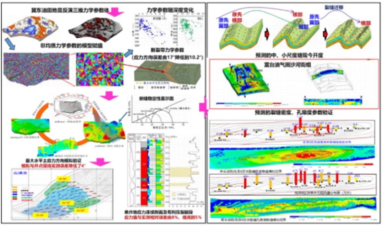 断缝结构定量预测方法 基于力学理论的应变能密度法、破裂率法、二元法、构造曲率法等,仅预测古裂缝密度分布,预测精度<85%(中石油塔里木油田分公司、中石油勘探开发研究院西北分院);多期岩石破裂准则局限于岩土工程领域,尚无针对地下储层考虑差异充填的多期裂缝叠加力学模型,井间裂缝有效性依靠井点随机插值(Schlumberger公司、GolderAssociates 公司);三维应力场模型网格精度>10m,断裂带力学参数采用经验法,四边形边界力学加载理念,模拟应力方向与实测误差为 17º,应力值与井孔实测相对误差为8%(中石油冀东油田分公司) 古、今应力场结合预测现今断缝参数三维分布,裂缝密度预测精度达92%,裂缝开度预测精度达90%;考虑伸展、挤压应力状态,建立基于差异充填的岩石多期复合破裂准则和多期断缝叠 加力学模型,融合水-岩作用模拟和多场耦合数值模拟,实现基于热液反应机理的裂缝有效性空间表征;考虑地 层孔隙压力,三维应力场模型网格 2-5m,实现了非均质三维力学参数体构建,六边形边界力学加载克服了应力畸变效应,模拟应力方向与实测误差为10.2º, 应力值与井孔实测相对误差为5%以内