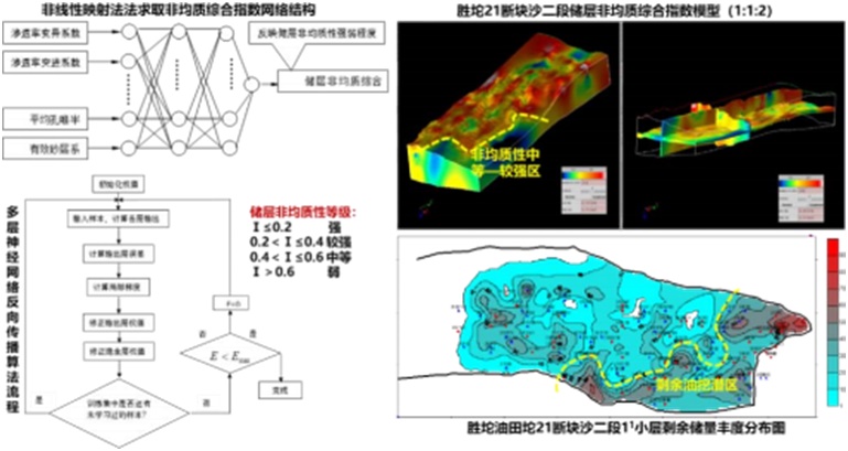 线性和非线性数学理论相结合,针对不同含水阶段和油藏类型,选取数据包络法、多层神经网络法等,非均质性表征参数达13个,克服了方法单一、参数尺度不一、权重不清的技术难题,非均质刻画与剩余油富集吻合率达93%