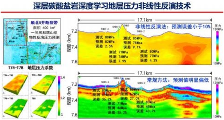 本成果提出岩芯(点)-测井(线)-地震(面)跨频段多尺度岩石物理建模方法,建立深层碳酸盐岩深 度学习地层压力非线性反演技术。