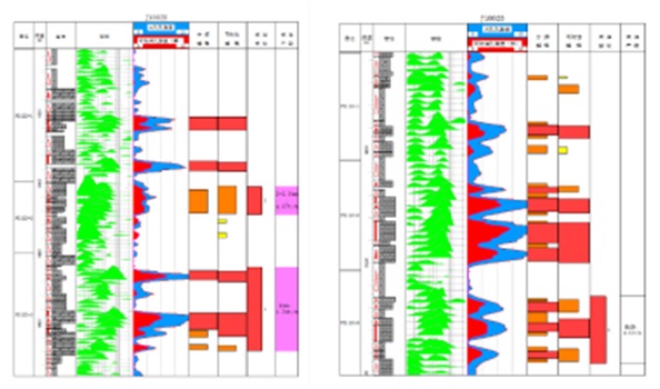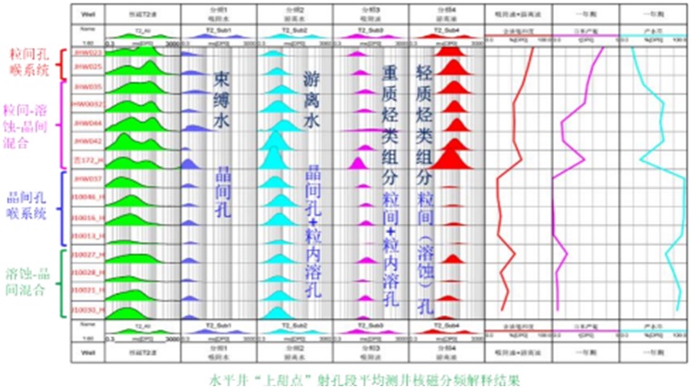 该成果基于拟油藏条件下不同性质流体在相同尺寸基质孔隙内的核磁共振实验,并利用核磁分频技术实现了基于核磁测井的不同性质流体核磁信号分离,实现了全井段油/水分布定量描述。进一步基于能量衰竭-核磁联测实验,建立了综合考虑温度、压力、流体性质以及孔喉结构的衰竭开发模式下页岩油可动效率定量评价方法,实现了全井段可动油分布特征。综合储层物性、含油性和可动 性,实现页岩油甜点段自动识别及等级划分,为页岩油井位部署、射孔层段优选提供指导。