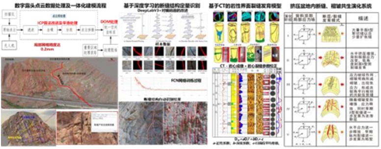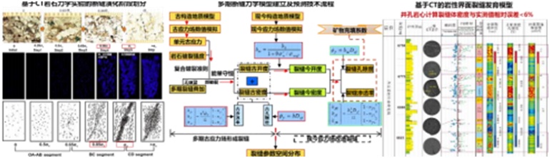 基于几何规模的断缝发育地质模式、基于应力类型的断缝力学模式、岩石力学层约束的多尺度断缝模式,缺少尺度概念,考虑因素单一;数字露头模型(精度达 1mm)(中石油杭州地质研究院、 UniversityofPavia、Bentley软件公司)和数字岩心模型(微米级、纳米级),精度高,作为地下裂缝建模的参考或补充(浙江大学、中国石油大学(华东)) 形成了多源数据融合的一体化露头模型构建技术,融合抵近倾斜摄影数据 采集、数字露头模型(局部精度达0.2mm)和数字岩心模型(微米级),结合实验测试划分断缝期次,结合深度学习和岩石力学层划分断缝尺度,建 立了忠实于露头数据的原型地质模型,结合构造序次理论划分出区域和 局部伴生型、派生型及继承型等断缝 类型,建立了典型应力环境的断缝发 育序次模式,实现了真正意义上的多 元露头信息与地下裂缝建模有机融合
