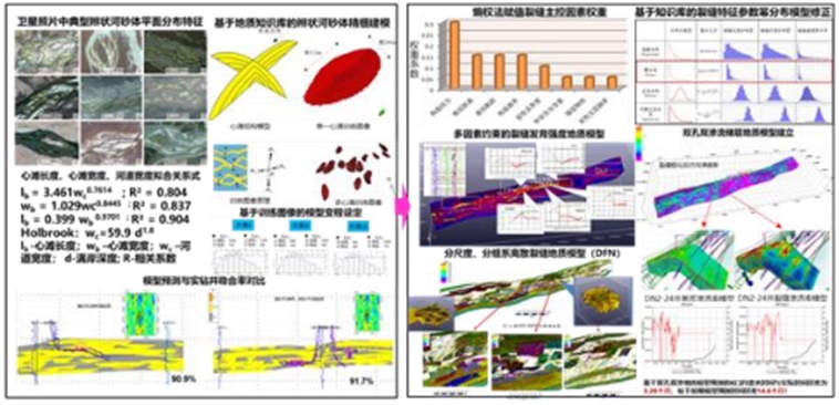 断缝储地质建模方 法 砂体建模方法有序贯高斯、多点地质统计学、多级相控等,以单一数据为主,识别精度为小层,井间连通关系不确定性大,单一厚砂体预测与实钻符合率达85-90%(大庆油田、Schlumberger 公司、);确定性建模和随机建模方法相结合,考虑多种控制因素构建裂缝密度驱动体,采用软件自带指数分布模型、幂分布模型、Fisher分布模型Kent分布模型等等表征裂缝特征参数和产状分布,分尺度构建离散裂缝网络模型和双孔双渗地质模型,模型预测的裂缝密度、储层物性、含油气性与实钻相对误差为92%( 阿什卡公司 、Golder Associates 公司) 通过野外露头区和密井网试验区精细解剖建立砂体结构地质知识库,作为 建模主变程和次变程关键参数取值的依据,明确砂体规模地质统计学规律,模型预测储层物性与实钻符合率达90.5%;对断缝分期、分级的前提下,采用熵权法、神经网络算法量化不同 裂缝参数主控因素的权重,构建中、小尺度缝密度驱动体,通过确定岩石力 学层对不同尺度裂缝限制条件,修正 表征裂缝长度参数的幂分布模型,优 选 Bingham 双峰分布模型构建中、小尺度离散裂缝地质模型和双孔双渗地质模型,模型预测的裂缝密度、储层物性、含油气性与实钻吻合率达到96%