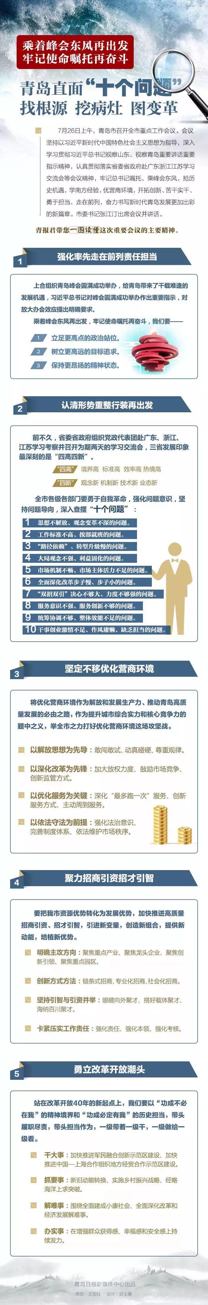 近日,全市重点工作会议在市级机关会议中心召开。 会议围绕招商引资、招才引智工作推进“一次办好”改革优化营商环境提出了新的要求。 市委书记张江汀出席会议并讲话。 张江汀指出,今年是青岛历史上极不平凡的一年,上合组织青岛峰会圆满成功举办,给青岛带来了千载难逢的发展机遇。 我们要深入学习贯彻习近平总书记重要指示要求,乘着峰会东风再出发,牢记使命嘱托再奋斗,以优异成绩回报总书记的厚望和重托。直面“十个问题” 张江汀指出,省党政代表团到广东、浙江、江苏学习考察,看到三省发展气魄大、势头盛、举措强、成效好,让我们有一种坐不住、等不起、慢不得、睡不着的紧迫感和危机感。 全市各级各部门要坚持问题导向,对标先进找差距,深入查摆“十个问题”。