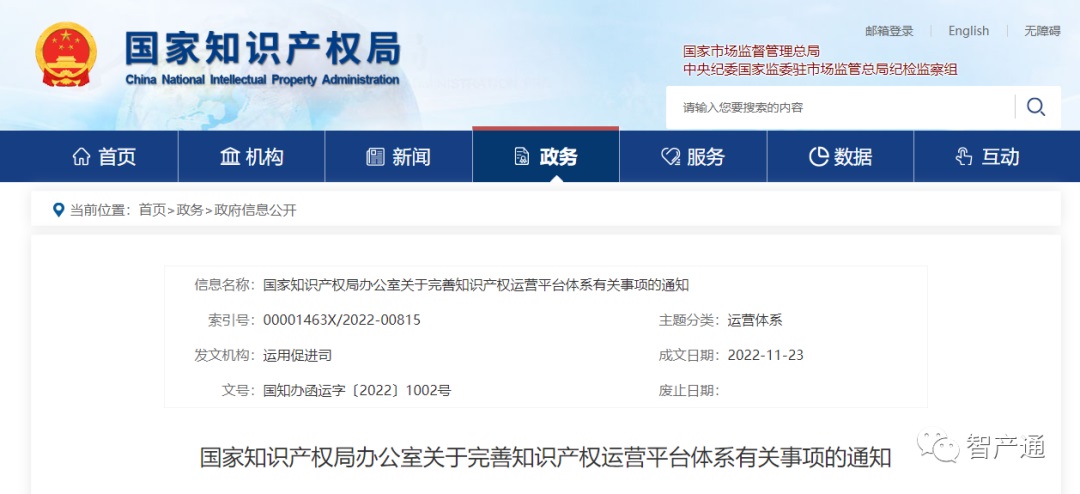为深入贯彻落实党的二十大精神,推进落实党中央、国务院印发的《知识产权强国建设纲要(2021—2035年)》和国务院印发的《“十四五”国家知识产权保护和运用规划》,将中办、国办印发的《建设高标准市场体系行动方案》关于“建设国家知识产权和科技成果产权交易机构”部署落实落地,按照《国家知识产权局关于促进和规范知识产权运营工作的通知》(国知发运字〔2021〕22号)要求,推进实施知识产权运营体系建设工程,在前期工作基础上,进一步完善知识产权运营平台体系,现将有关事项通知如下: