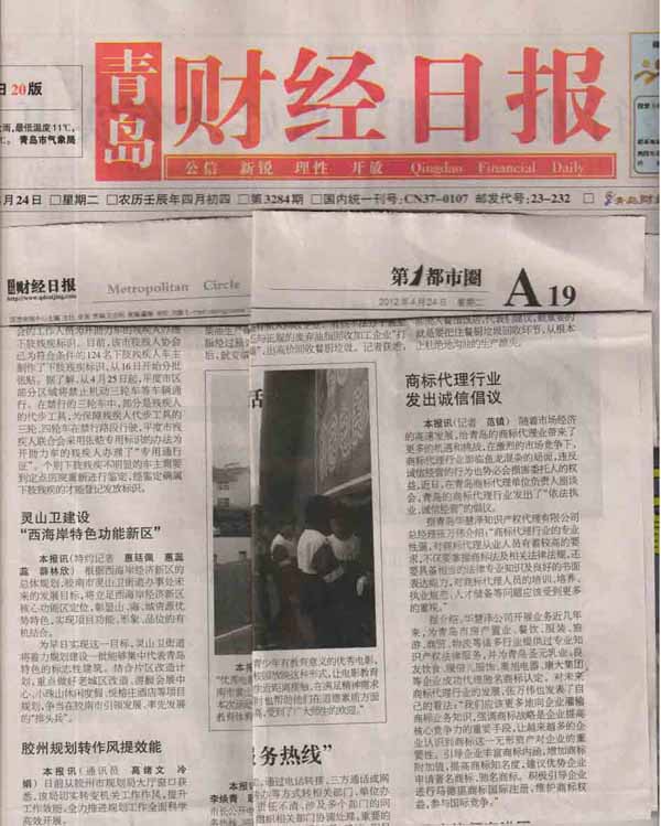 会后青岛财经日报就本次会议的相关问题,采访了我公司总经理张万伟。(请见青岛财经日报2012年4月24日A19版新闻标题为商标代理行业 发出诚信倡议)