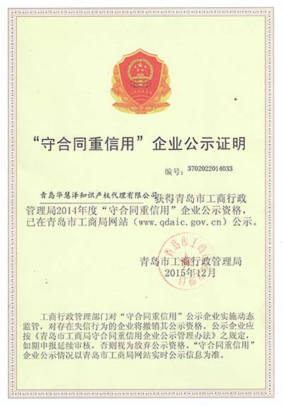 2015年12月,我公司被青岛市工商局授予 2014年度“青岛市守合同重信用企业”称号。