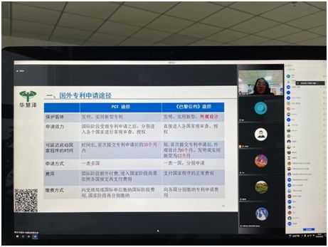 本次培训邀请华慧泽专利事务所资深专利代理老师授课,针对国际专利申请的要点和难点,从如何选择申请途径、巴黎公约途径与PCT途径的区别和程序性技巧、如何进行国际专利布局、申请文件的准备以及费用构成五部分进行讲解,分享代理国外专利申请案件心得体会。据在线统计数据显示,来自各学院相关教师、学生300余人参与了线上培训学习。